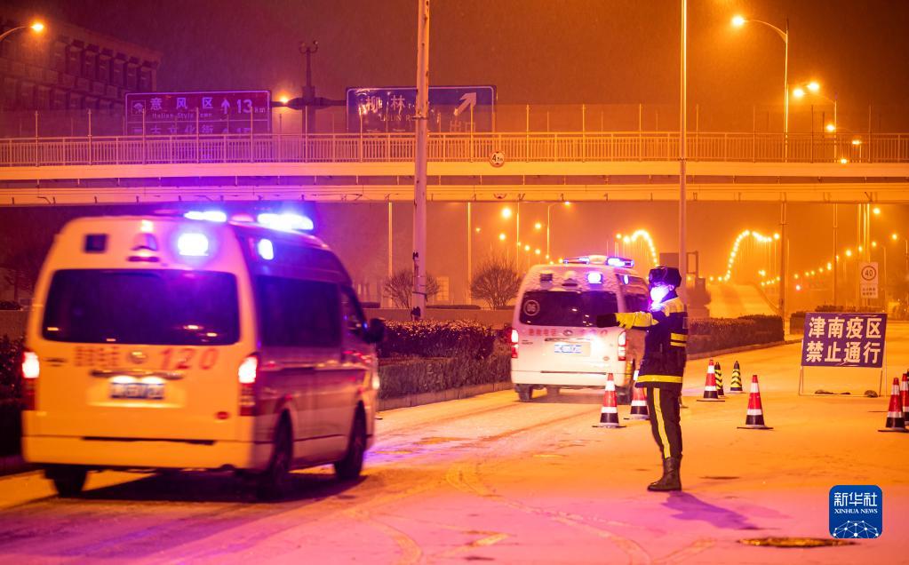 1月22日,在天津市津南区某公路卡口处,骑警队员在雪夜里保障救护车辆进入通畅。