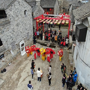1月20日,在前童古镇老街上,正在训练的舞狮队和游客互动。