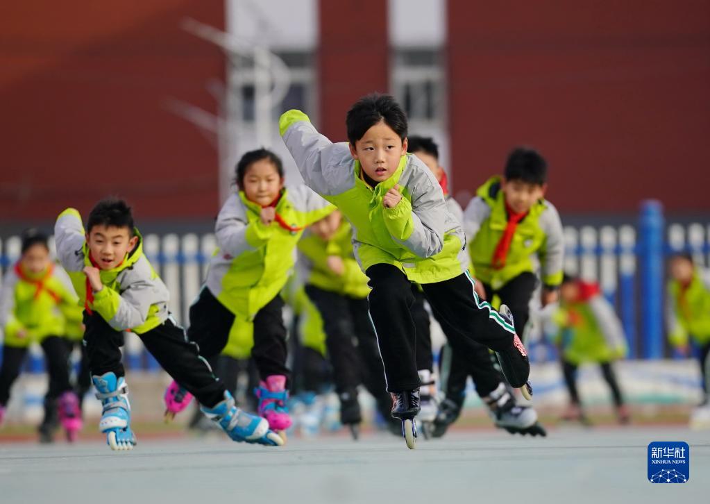 2021年12月15日,在河北省滦州市第三实验小学,学生们在体育课上练习轮滑。