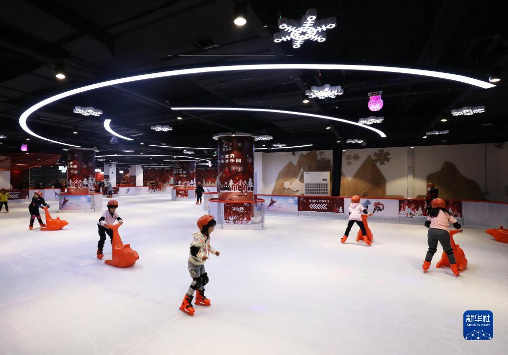 1月23日,小朋友们在石家庄市裕华区欢乐汇商场的滑冰场玩耍。