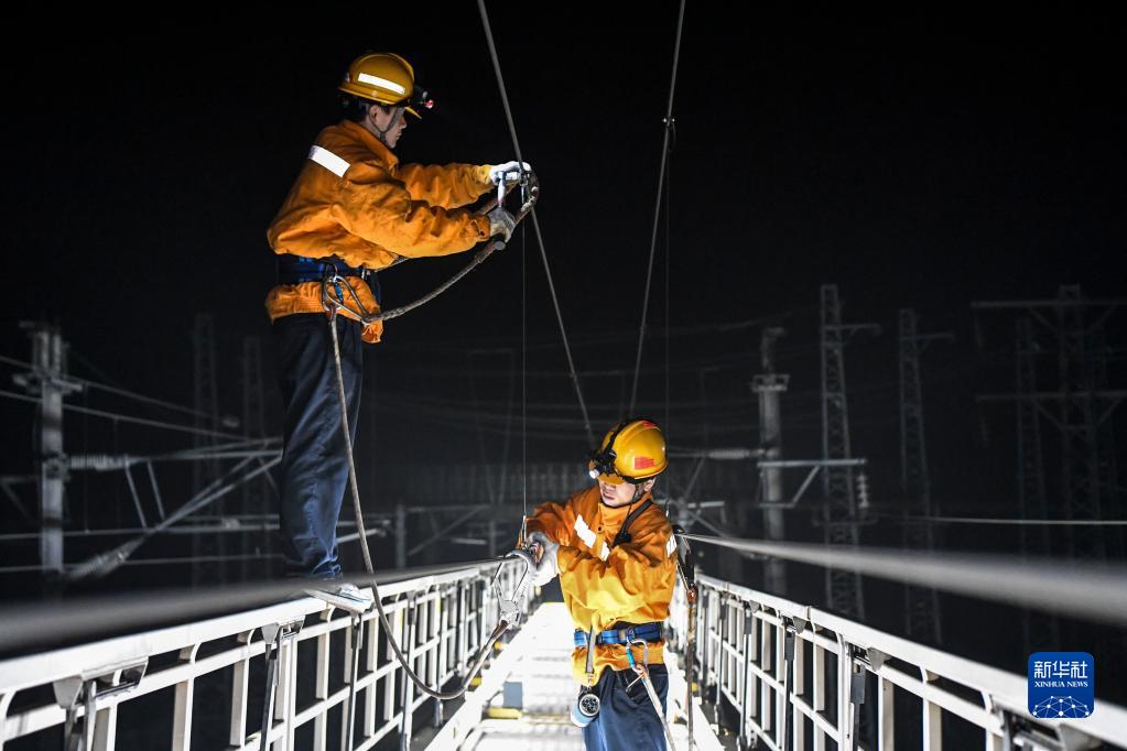 1月23日凌晨,接触网工在检调接触网吊弦。