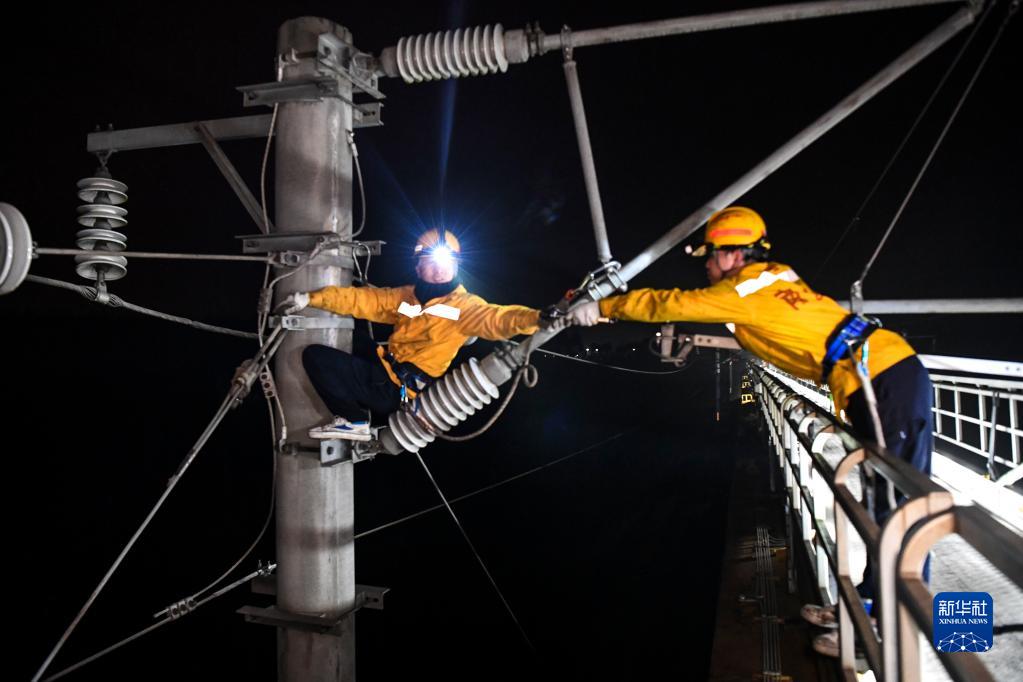 1月23日凌晨,接触网工在传递检修时所使用的工具。