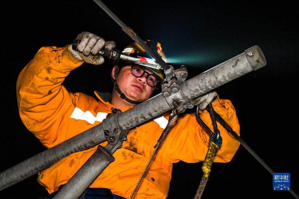 1月23日凌晨,接触网工使用力矩扳手紧固螺帽。