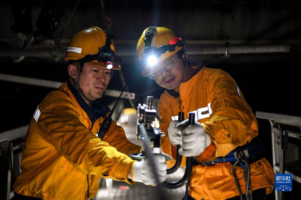 1月23日凌晨,接触网工使用工具处理接触线“硬点”问题。