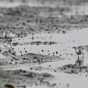1月23日,两只勺嘴鹬在海南儋州一处湿地觅食。