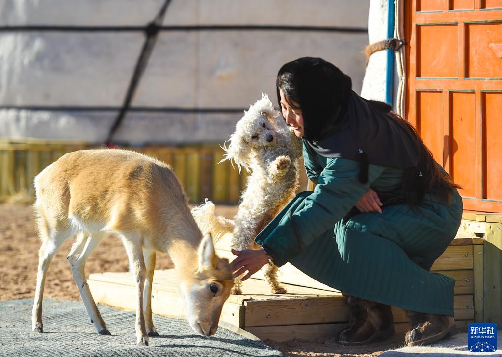 乌伊汗和小黄羊“蹦泼来”在一起(1月13日摄)。