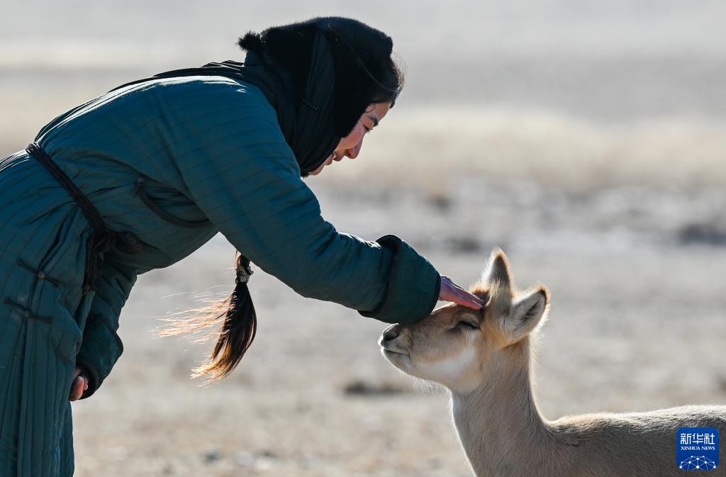 乌伊汗和小黄羊“蹦泼来”在一起(1月13日摄)。