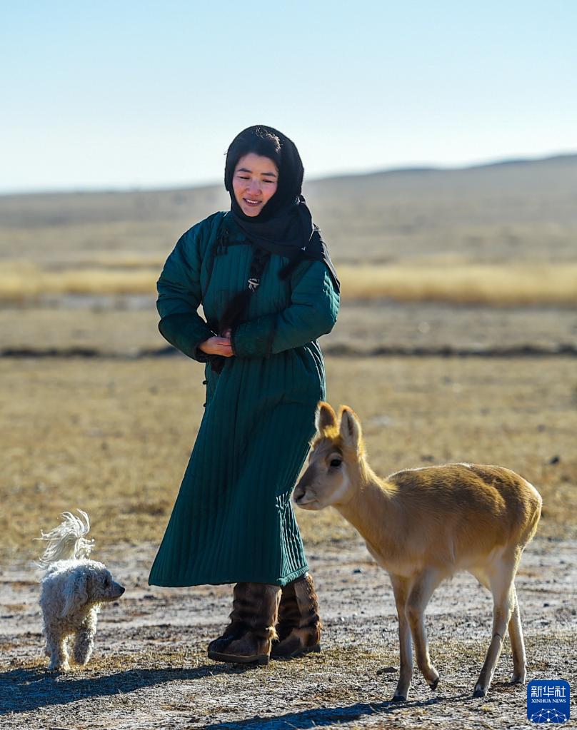 乌伊汗在草原上行走,小黄羊“蹦泼来”形影不离(1月13日摄)。