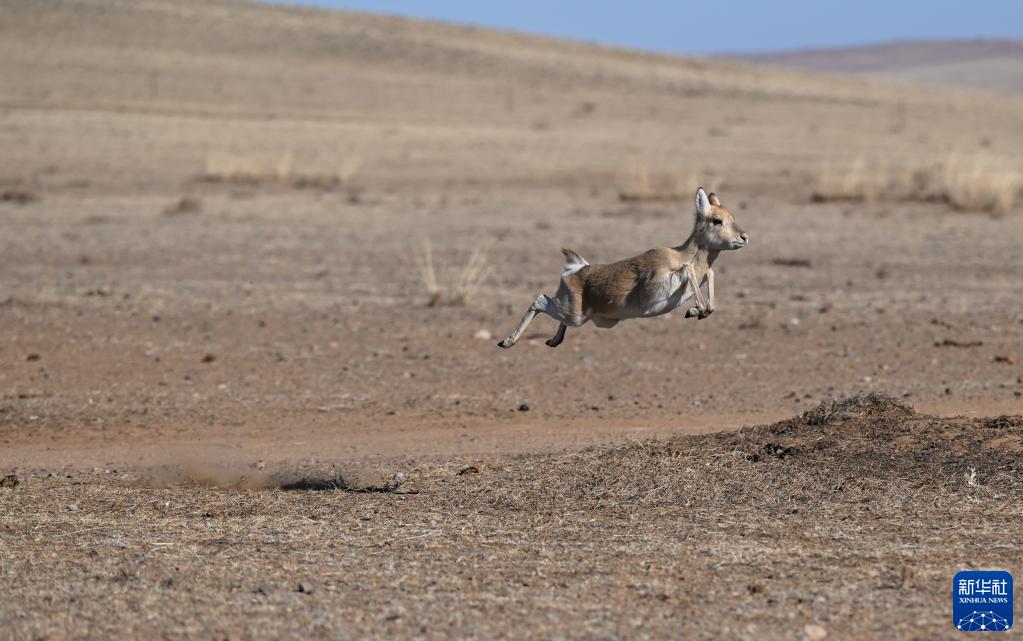 小黄羊“蹦泼来”在草原上奔跑跳跃(1月13日摄)。