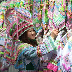 春节临近,贵州省毕节市竹园乡尖山村苗族群众来到家门口的民族服饰厂,选购自己喜爱的民族特色首饰、服饰,喜迎新年。