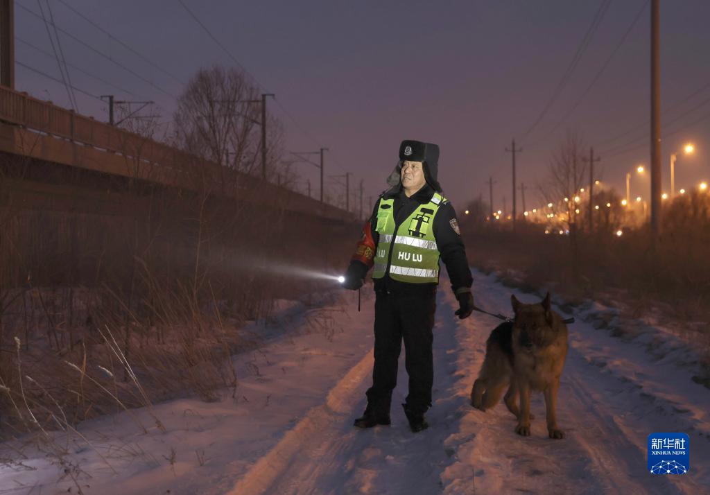 1月24日,巡防员于振龙和虎子在大庆西站附近的哈齐高铁沿线巡查。