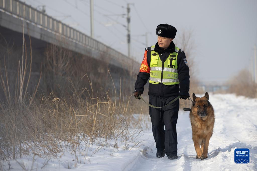1月24日,巡防员王洪彬和虎子在大庆西站附近的哈齐高铁沿线巡查。
