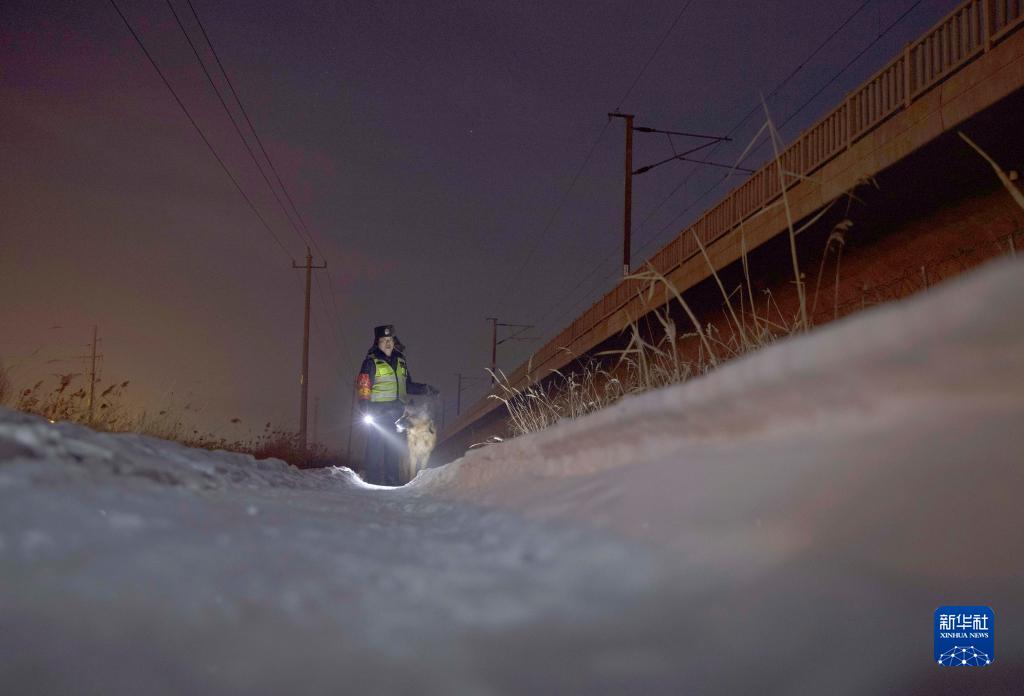 1月24日,巡防员于振龙和虎子在大庆西站附近的哈齐高铁沿线巡查。