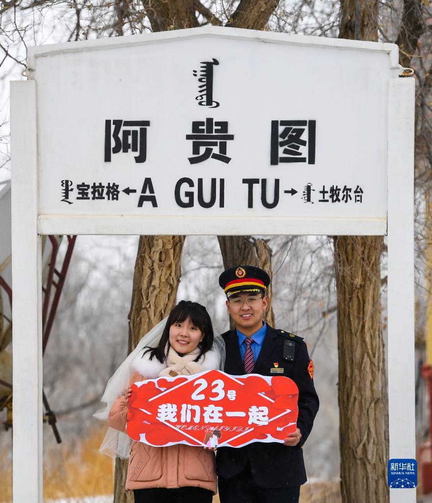 裴召勇的未婚妻张芳是包头货运中心大牛地车间的货运员,两人工作地点相距约600公里,平时聚少离多。“23日”对裴召勇和张芳来说,意义非同一般。他俩的生日都是在23日,相识也是23日,原本计划在2021年10月23日举办婚礼,但由于疫情和工作原因,他们的婚礼无奈推迟。今年春节裴召勇和张芳都要值班。为了能和裴召勇有一次短暂的相聚,倒休的张芳决定1月23日前往阿贵图站为裴召勇送去温暖和爱意。