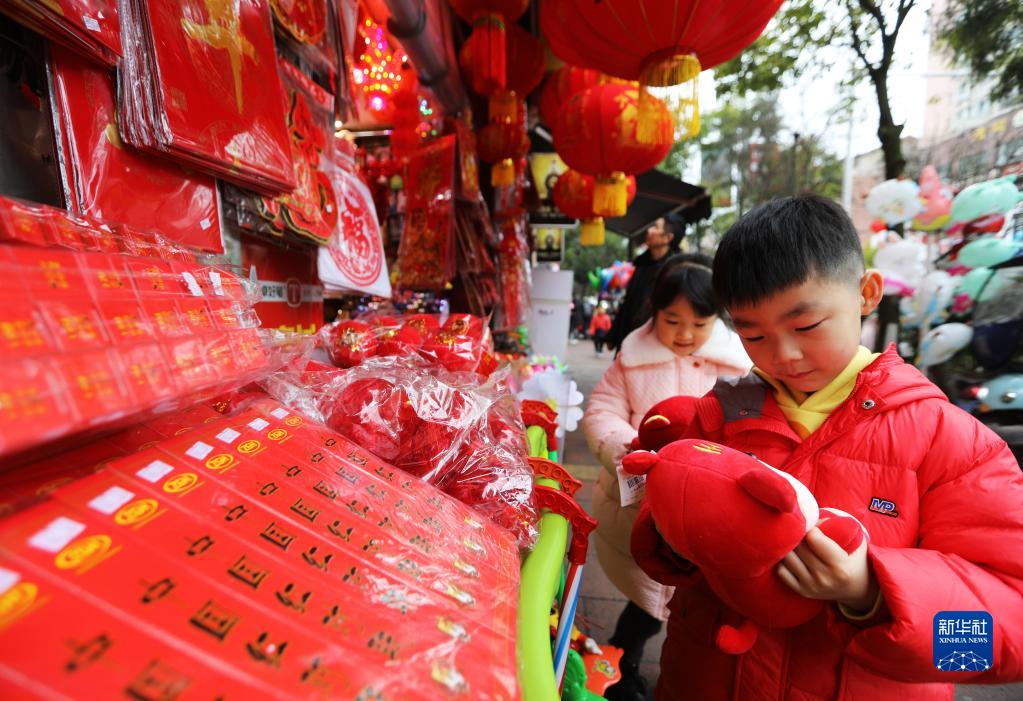 1月25日,小朋友在贵州省赤水市年货市场挑选春节饰品。