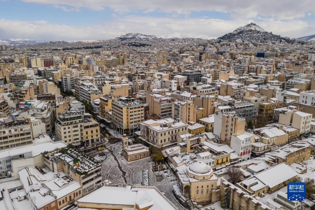 这是1月25日拍摄的雪后的希腊雅典市一景(无人机照片)。