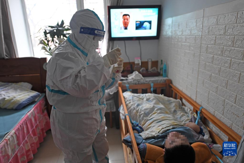 黄馨仪在天津市河东区东新街道某社区为行动不便的市民进行核酸采样(1月20日摄)。