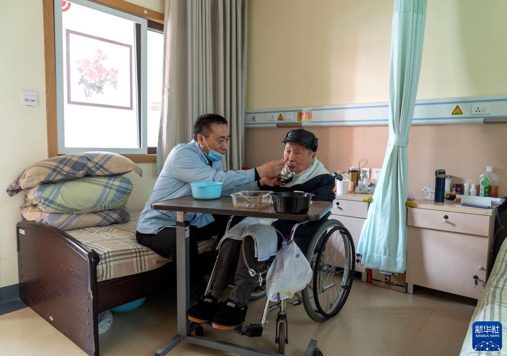 在百万庄养老照料中心,护理员郭相旭为老人喂饭(2021年12月10日摄)。