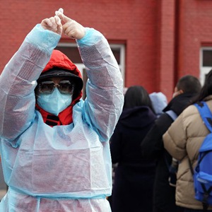 1月26日,在位于北京市西城区展览路街道的一处核酸检测采样点,工作人员(左)记录被检测人员信息。
