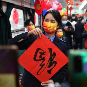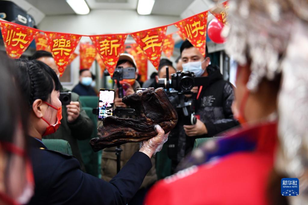当日正值小年,在从湖南怀化开往澧县的7266次列车上,列车乘务员利用休班时间,为旅客送上对联、福字,直播带货腊肉、冰糖橙等当地农产品,邀请旅客唱山歌,一同欢度小年。