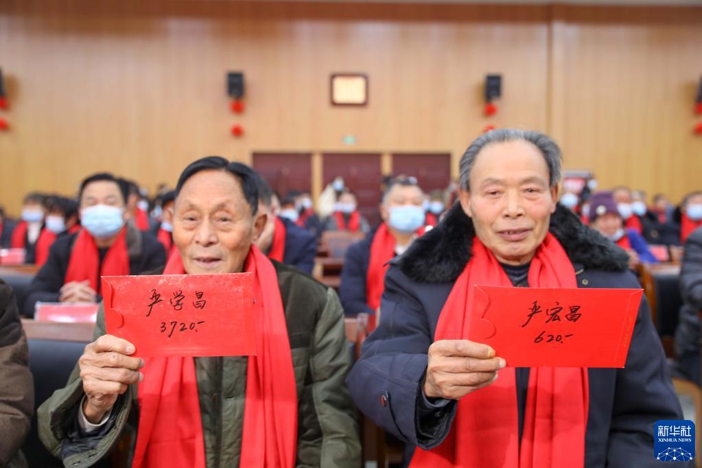 1月26日,在凤阳县小岗村,“大包干”带头人严学昌(左)、严宏昌展示自家领取的分红红包。