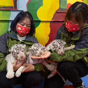 当日,浙江省湖州市长兴太湖龙之梦动物园已满月的三只白虎幼崽正式与游客见面,为虎年新春增添节日气氛。