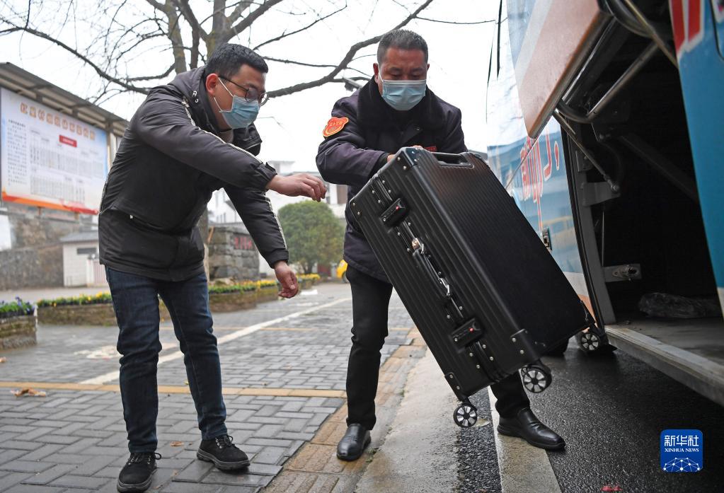 春节返乡村民(左)到达山区红星村站(1月26日摄)。