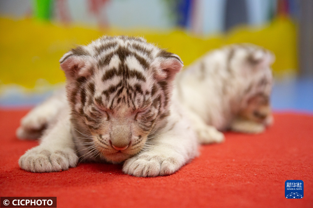 ↑2022年1月26日,浙江省湖州市长兴太湖龙之梦动物园已满月的三只白虎幼崽正式与游客见面。图为白虎幼崽在酣睡。CICPHOTO/伊凡 摄