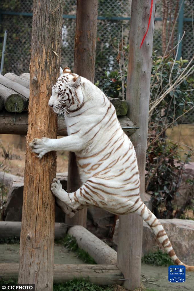 ↑2022年1月9日,江苏省南通森林野生动物园内,一只白虎在爬树。CICPHOTO/许丛军 摄