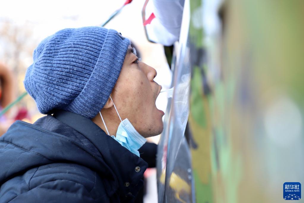 1月27日,在绥芬河市一处核酸采集点,一名居民接受核酸检测。