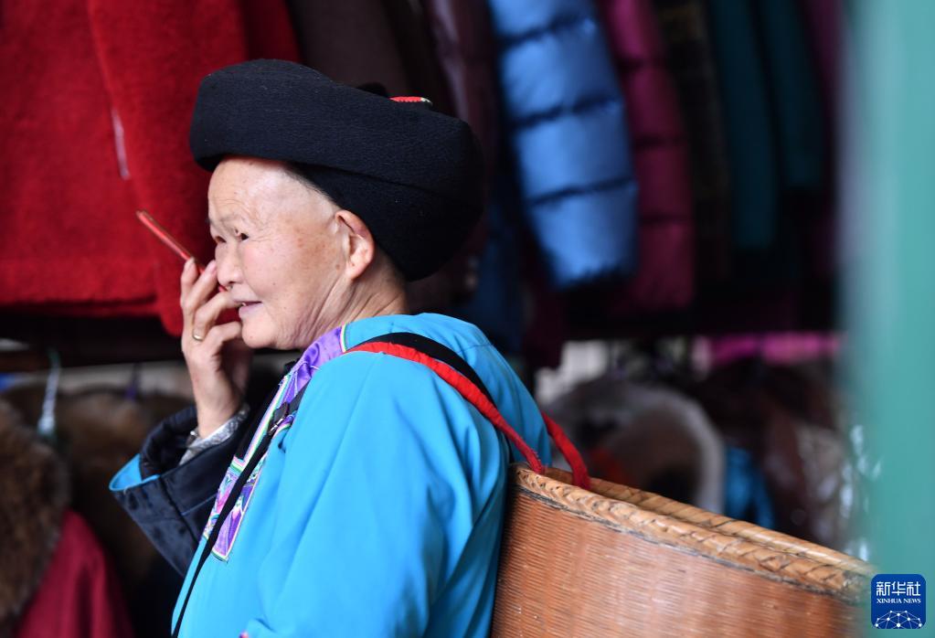 1月27日,一名苗族老奶奶在“赶场”时用手机与家人联系。