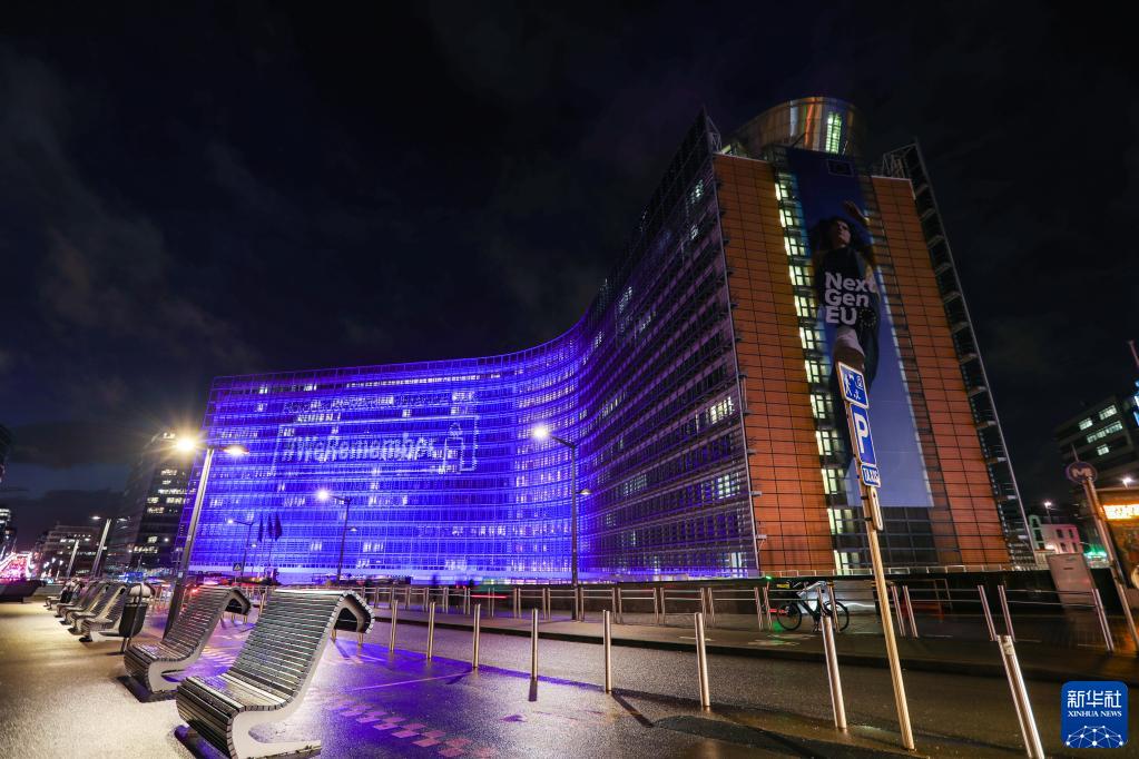 1月27日,位于比利时布鲁塞尔的欧盟委员会总部大厦被灯光点亮。
