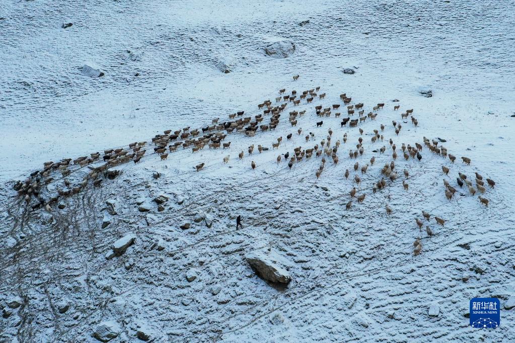 在新疆昭苏县阿合牙孜沟,牧民赶着羊群上山吃草(1月25日摄,无人机照片)。