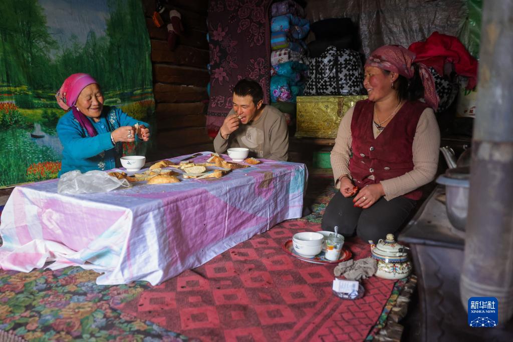 在新疆昭苏县阿合牙孜沟,牧民在家中吃早餐(1月25日摄)。