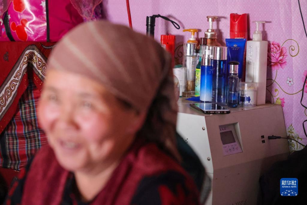 在新疆昭苏县阿合牙孜沟,牧民在家中聊天,其身后的光伏发电机上摆放着化妆品(1月24日摄)。