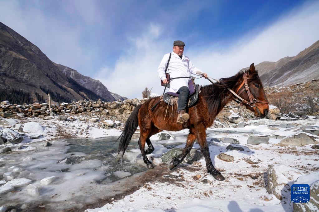 在新疆昭苏县阿合牙孜沟,牧业医院的医生骑马巡诊(1月25日摄)。