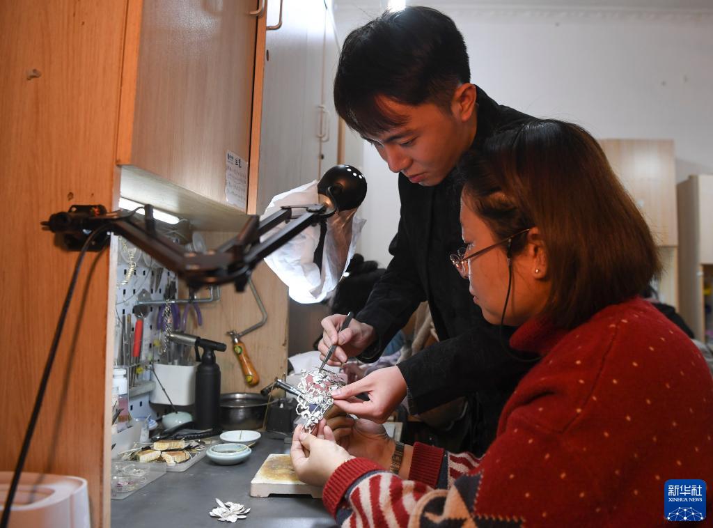 辜国强与工作室职工交流花丝镶嵌技术(1月25日摄)。