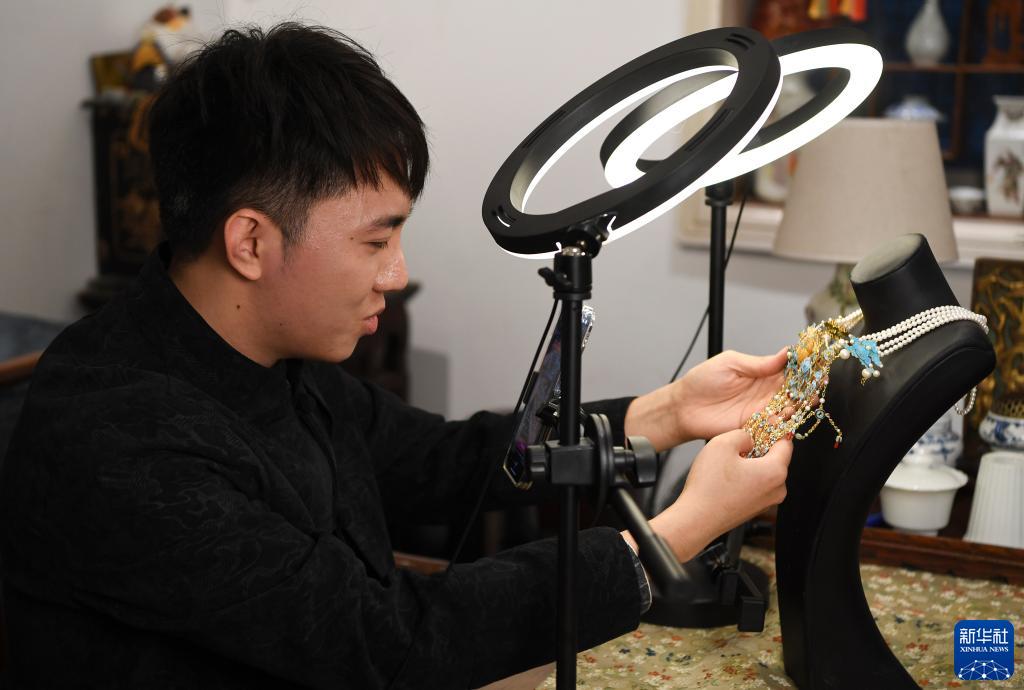 辜国强通过直播平台,向观众介绍花丝镶嵌作品(1月25日摄)。