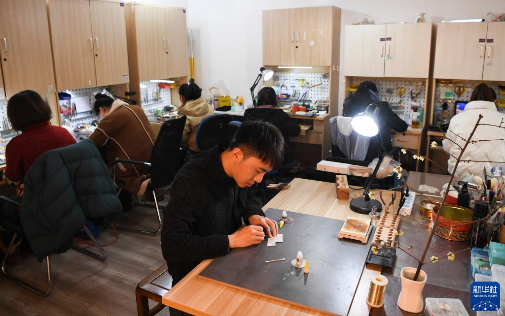 辜国强在创作花丝镶嵌作品(1月25日摄)。