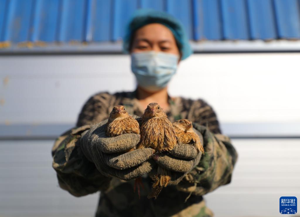 1月27日,在辽阳县壮大畜牧养殖专业合作社,工人展示饲养的鹌鹑。