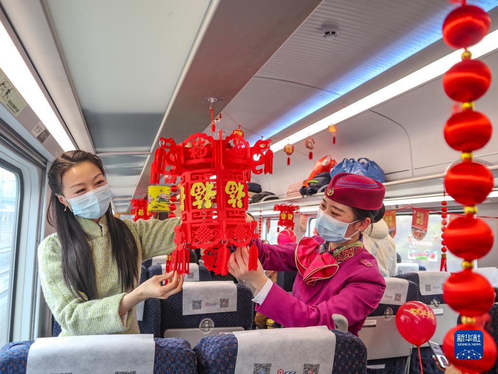 春节临近,中国铁路成都局集团有限公司重庆客运段联合重庆铁路公安处组织青年职工,将重庆西北环线C451次列车装扮一新,在做好疫情防控的前提下,为旅客带来一场自编自演的“高铁春晚”,让奔波的旅客增添欢乐,在旅途中体验别样“年味”。