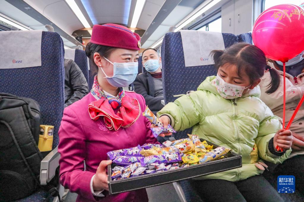 1月28日,在重庆西北环线C451次列车上,中国铁路成都局集团有限公司重庆客运段的青年职工为旅客分发新年糖果。