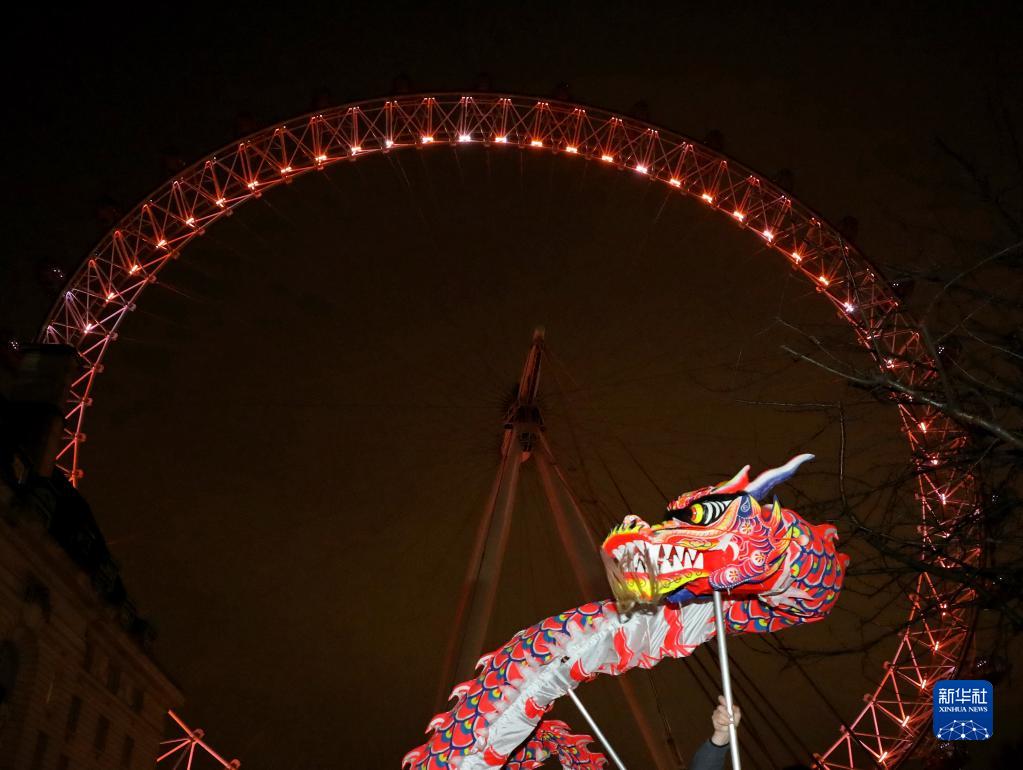 1月28日,在英国伦敦,演员在亮起“中国红”的“伦敦眼”前表演舞龙。
