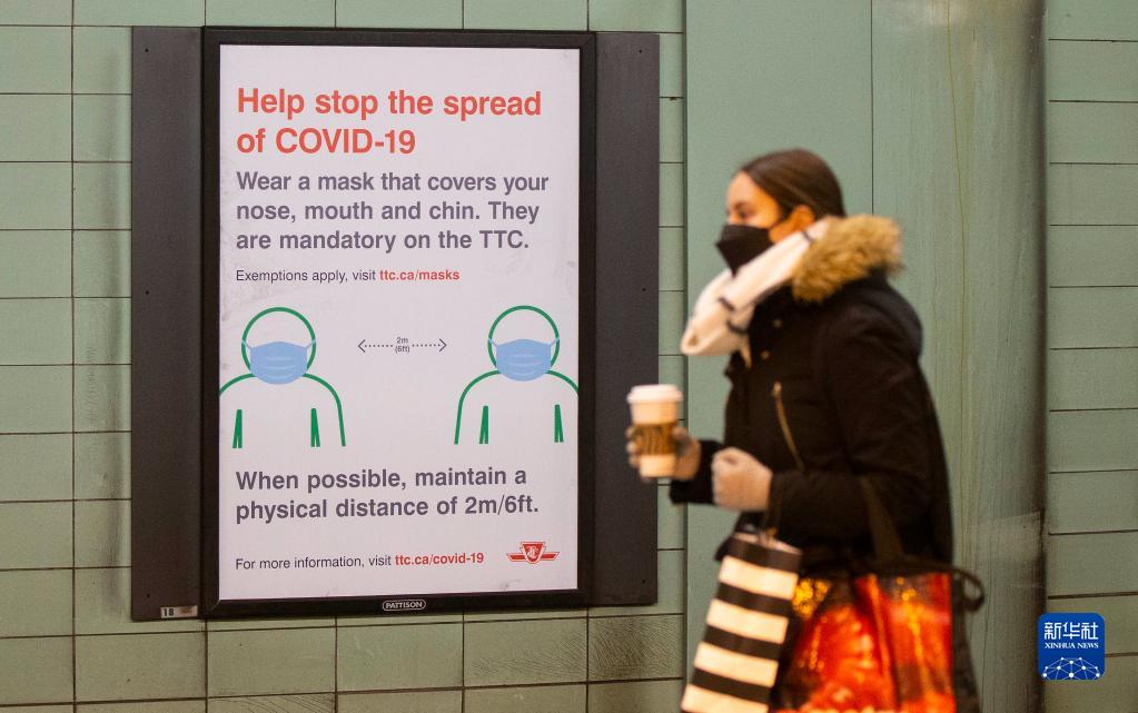 1月28日,在加拿大多伦多一处地铁车站,一名戴口罩的女子走过防疫提示牌。