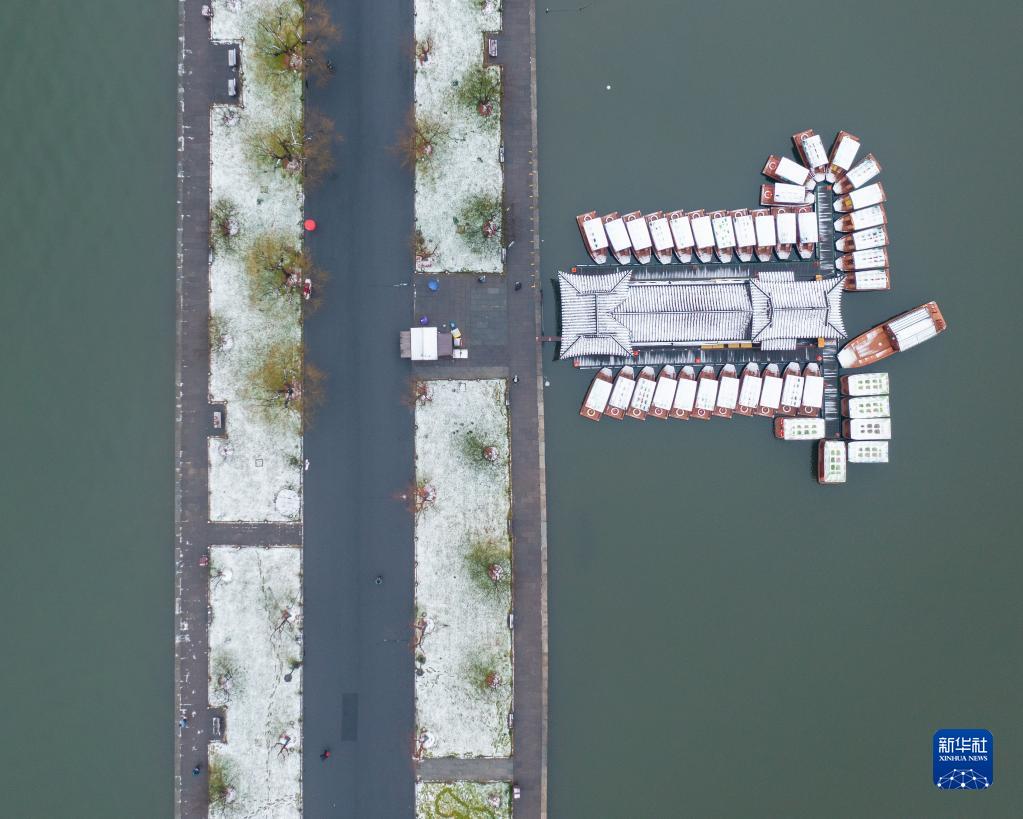 被白雪覆盖的西湖白堤(1月29日摄,无人机照片)。