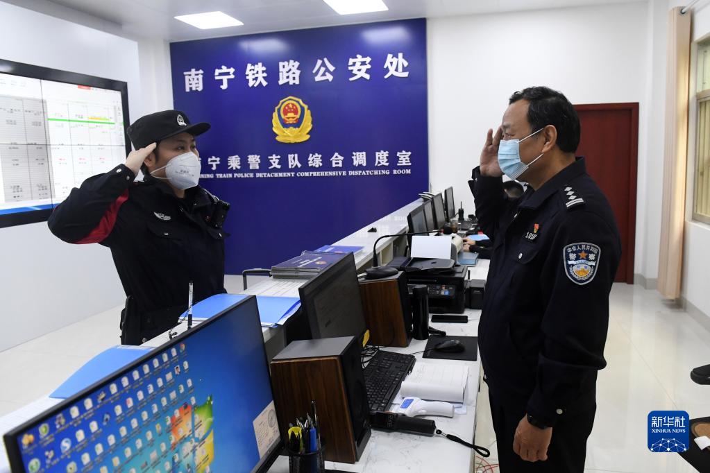 在南宁乘警支队综合调度室,孙方平给即将出乘的女儿孙艳琳派班后相互敬礼(1月28日摄)。