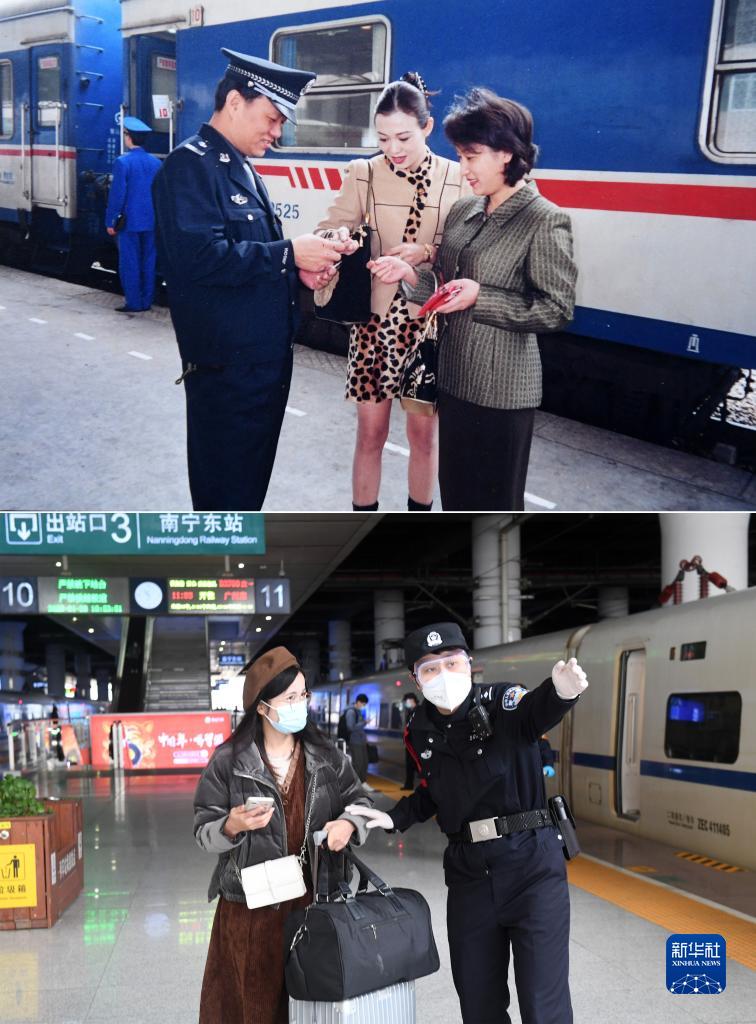 这是一张拼版照片。上图:2001年,孙方平值乘南宁至北京西的Z5次列车时,为旅客找回遗失的耳环(受访者供图);下图:2022年1月28日,在南宁东站,孙艳琳在为即将乘坐南宁东开往广州南动车的旅客提供咨询服务(新华社记者陆波岸摄)。