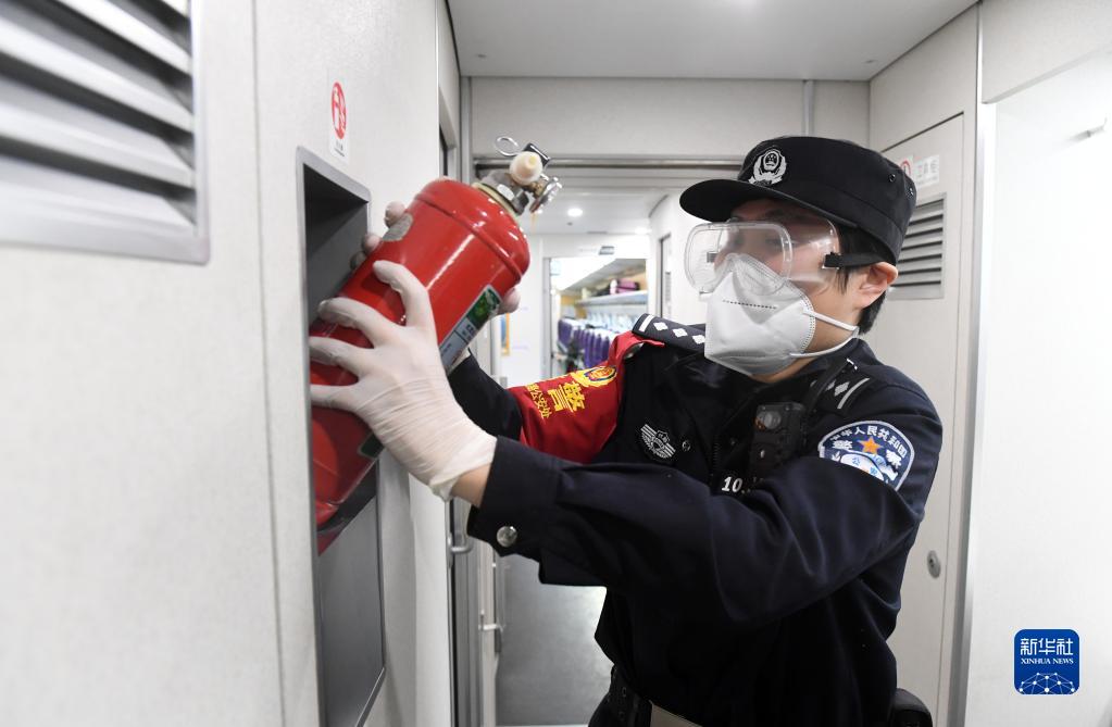 在南宁东开往广州南的动车上,孙艳琳在检查列车灭火装备(1月28日摄)。