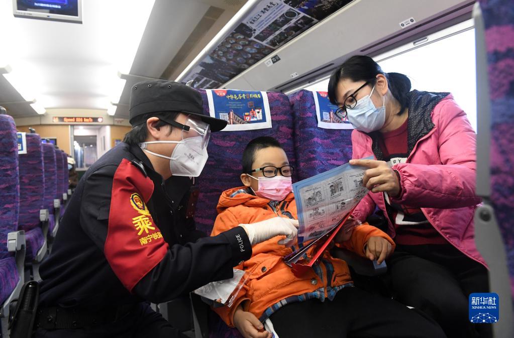 在南宁东开往广州南的动车上,孙艳琳在给旅客做出行安全宣传(1月28日摄)。