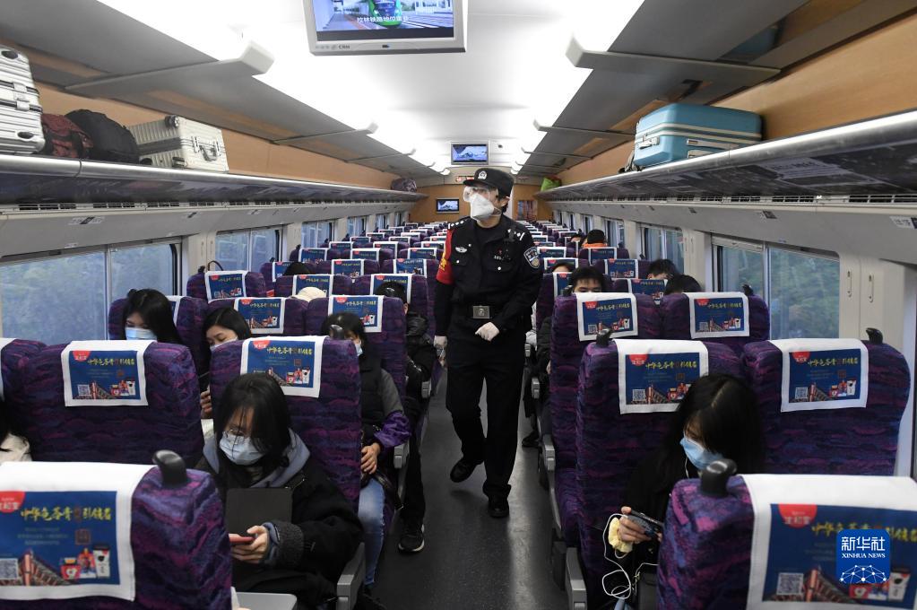 在南宁东开往广州南的动车上,孙艳琳在车厢内巡逻(1月28日摄)。